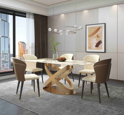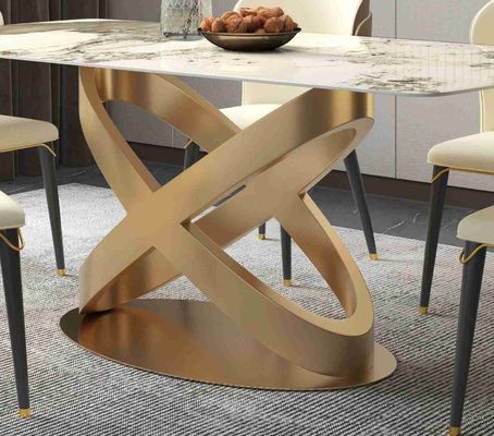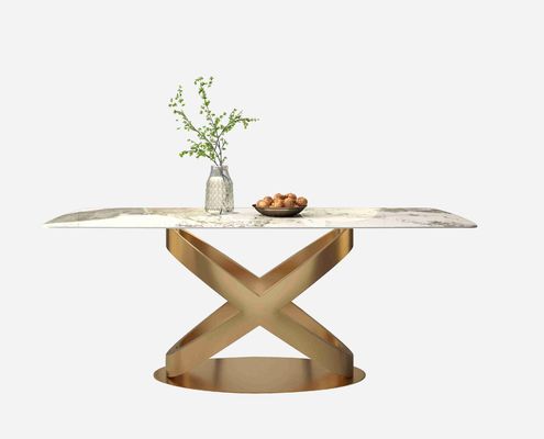 Meja Makan Batu Persegi Panjang Putih Modern dengan Alas Perunggu Desain Baru