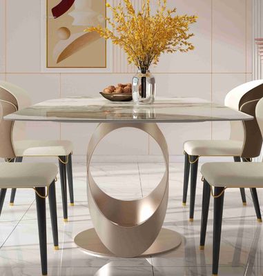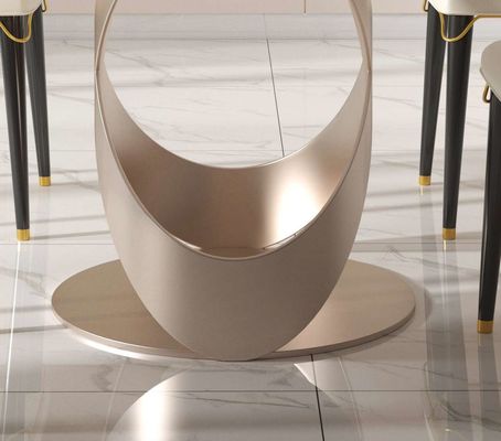 Dilengkapi dengan meja batu sudut bundar yang halus dan alas baja tahan karat X yang stabil, meja ini menambahkan sentuhan halus pada ansambel ruang makan Anda.