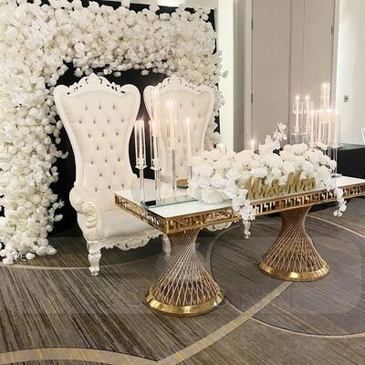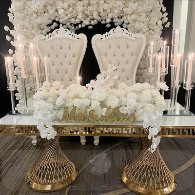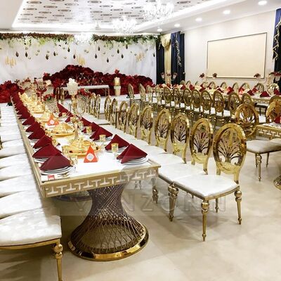 | Nama produk: | Personalize emas stainless steel meja pernikahan persegi panjang desain logam modern untuk makan restoran pesta hotel aula |